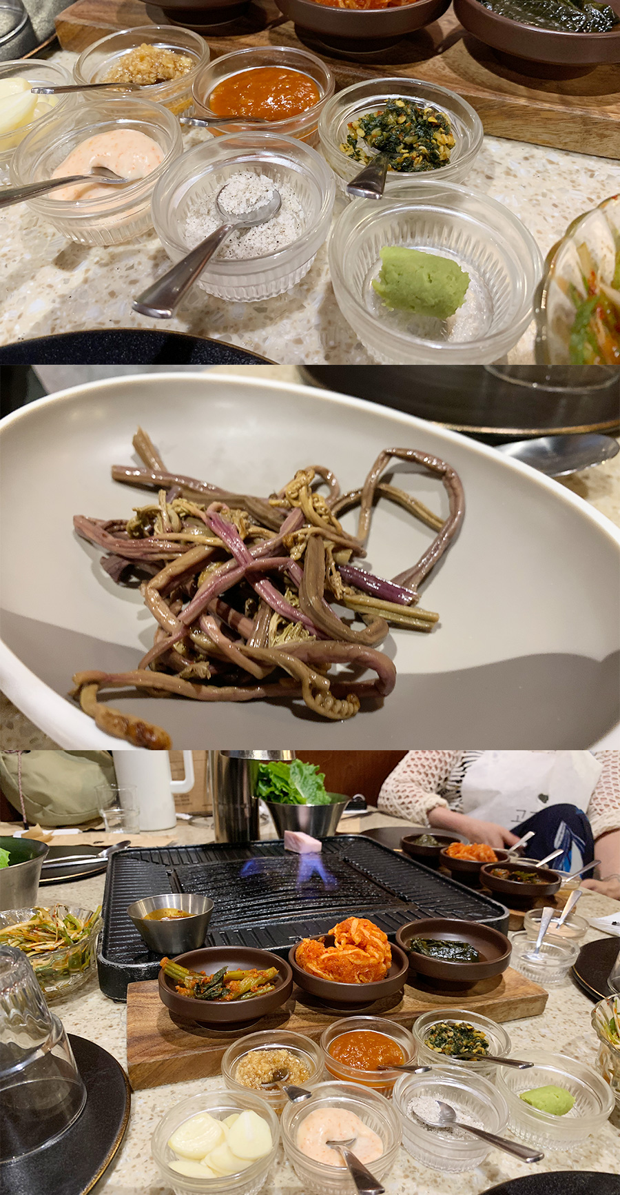 그리고 제주 흑돼지구이 집이라 고사리도 나왔고, 파절이랑 고사리 조합이 정말 꿀 조합이었다. 그리고 찍어먹을 수 있는 소스와 양념장이 다양해서 흑돼지를 여러 가지 맛으로 즐길 수 있었다. 명란 마요, 소금, 쌈장, 마늘소스, 자체 소스, 고추냉이 가 있고, 명이나물, 갓김치, 무채랑 같이 먹으면 개운하고 리필도 계속 부담 없이 해서 먹을 수 있었다. 5명 치고는 가격이 좀 많이 나왔지만.. 고깃값보다는 하이볼 가격 때문에 좀 나온 것 같다. 이게 여행의 묘미 기도하다. 처음에 고기 먹을 때도 고기 질이 너무 좋아 보였다. 목살이 엄청 고소하고 부드러워서 하나 더 먹었다.