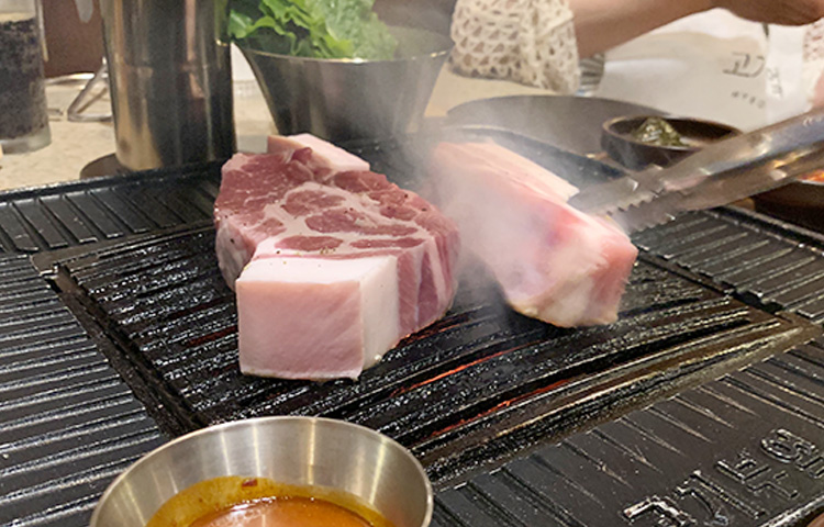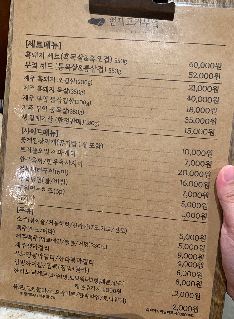 메뉴판을 보고 5명이서 흑돼지 세트 하나와 생갈빗살, 전복 버터구이(6 미), 하이볼 4잔을 시키고 먹다가 삼겹살보다 목살이 더 맛있어서, 제주 흑돼지 목살 1개를 더 추가해서 먹었다. 고기도 처음부터 직원이 엄청 잘 구워주고 직원도 서비스가 좋았다.